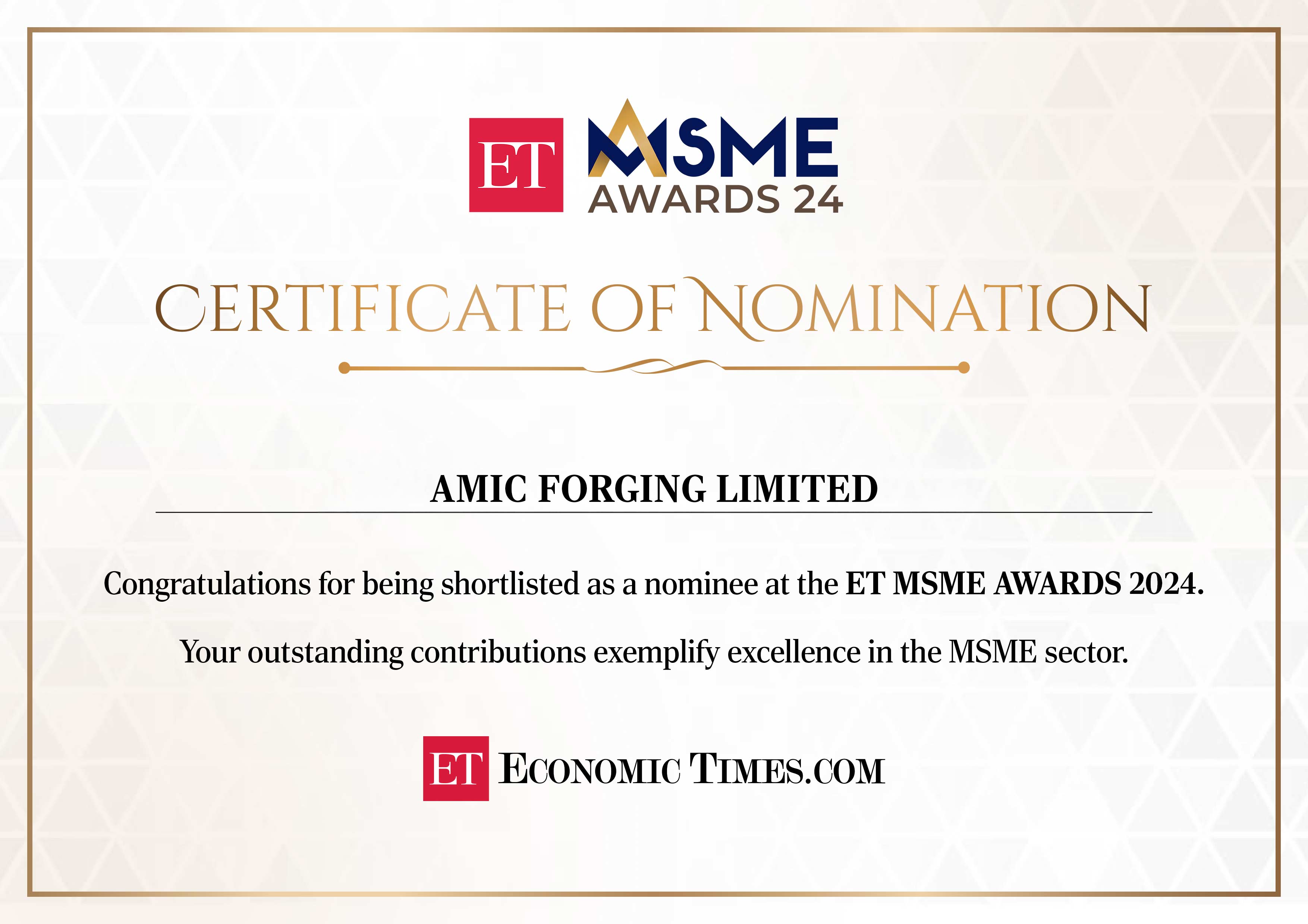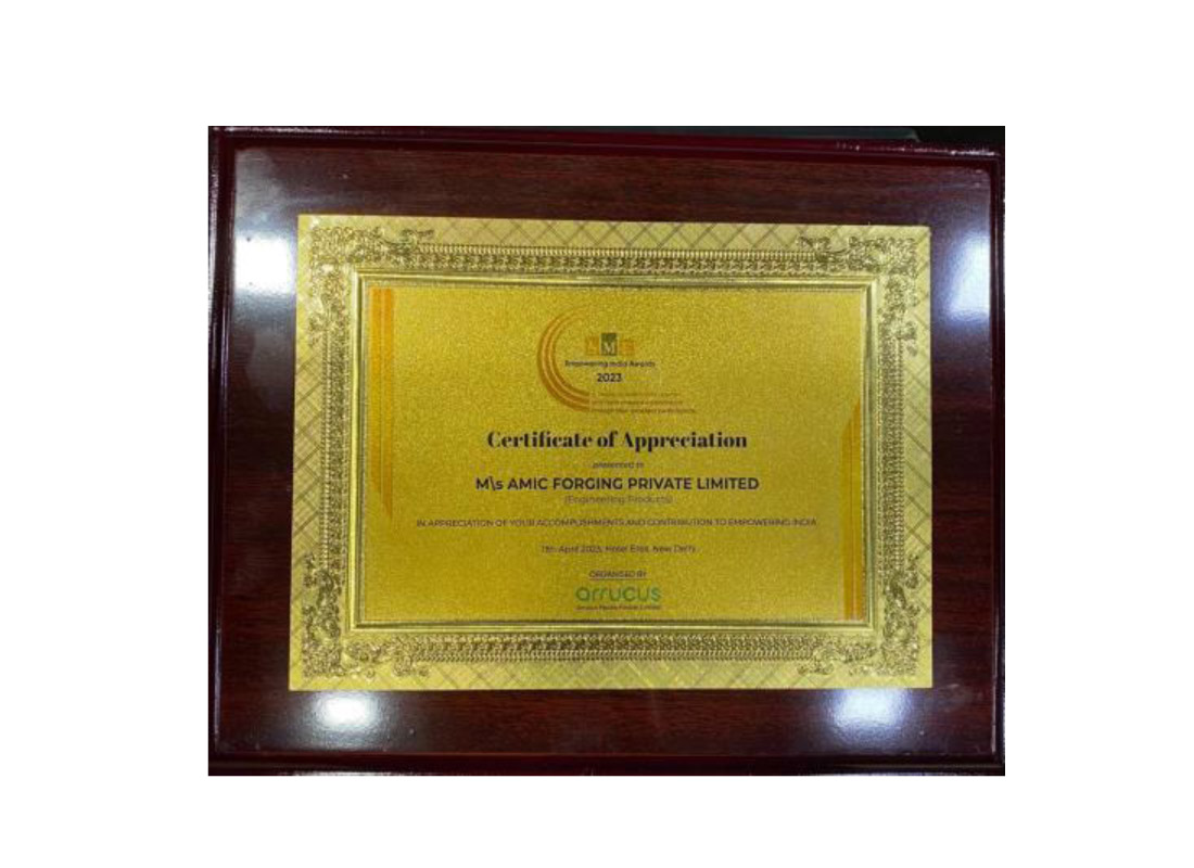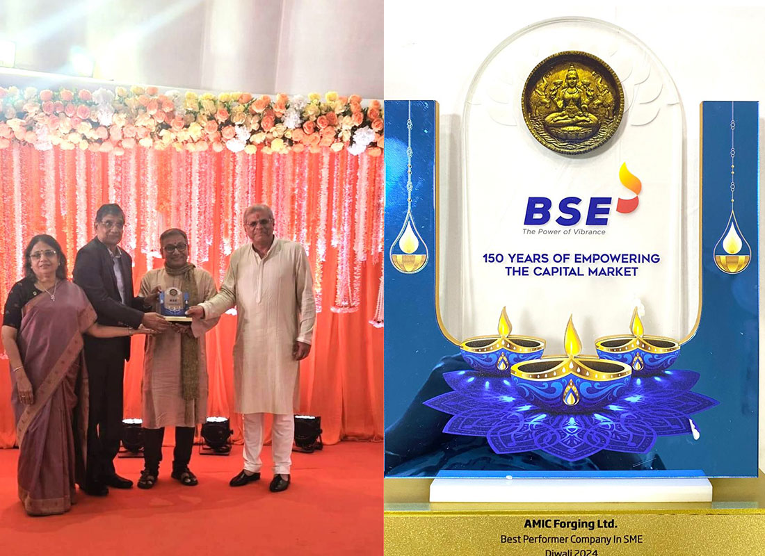On the auspicious occasion of Luxmi Puja and Muhurat Trading on November 1st at the BSE, Mumbai, AMIC Forging Ltd. was awarded the prestigious "Best Performer Company in SME". The honor was presented by Shree Amit Chandra, Chairman of Bain Capital, and Shree Sundararaman Ramamurthy, MD and CEO of BSE, in the presence of Smt. Radha Kirthivasan, Head of SME Listing